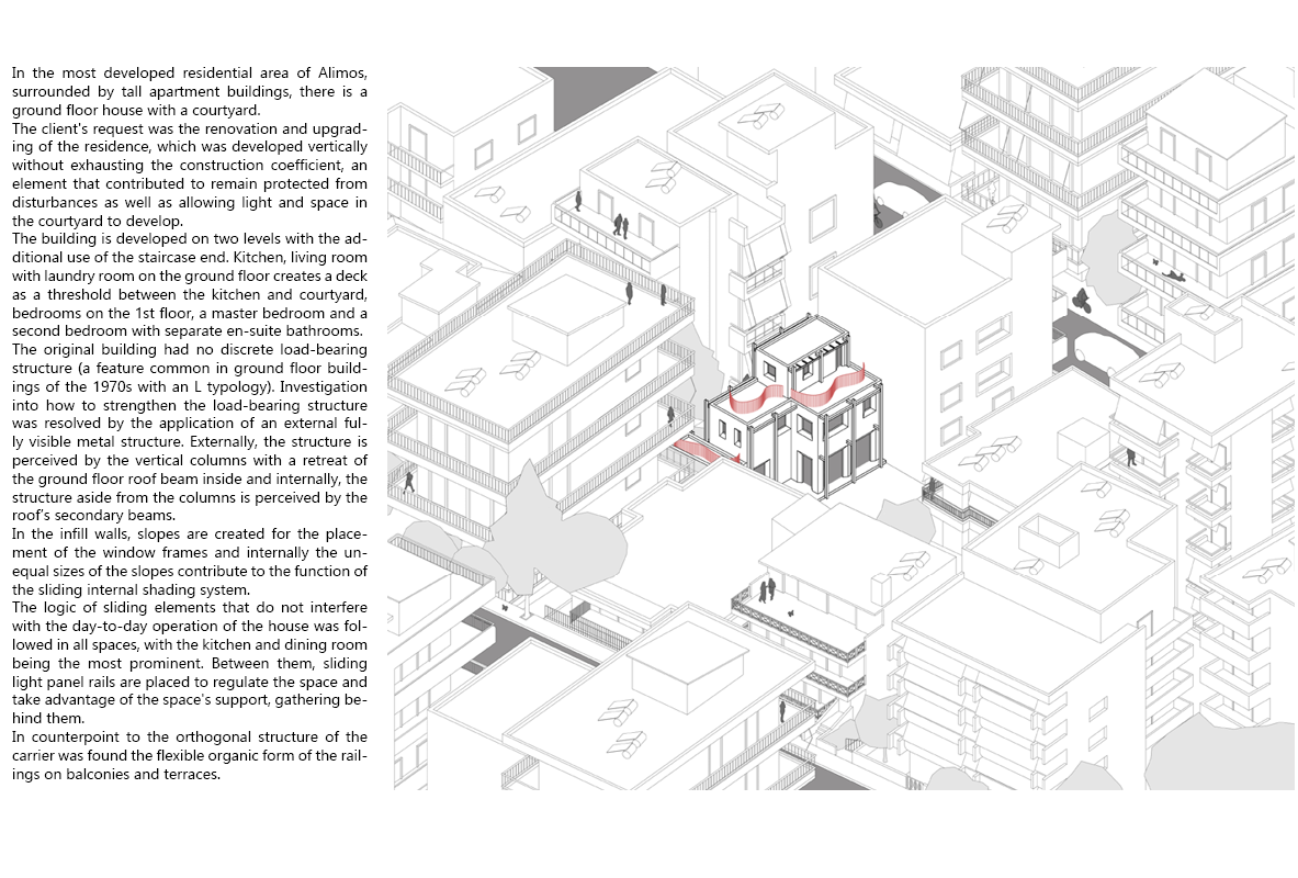 Project title: New, steel structure, 3-storey residence Location: Alimos, Attica Design (Year): 2021-2023 Construction (Year): 2023 Architectural Design: Elina Varouxaki Structural Engineering: Vasilis Varouxakis E/M Engineering: Dimitris Varouxakis Participated in Biennale 2024